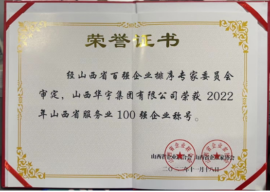 2022年12月18日山西省企業(yè)聯(lián)合會、山西省企業(yè)家協(xié)會以“弘揚企業(yè)家精神、踔厲奮進新征程”為主題,在太原召開了山西企聯(lián)第30次年會暨2022年山西100強企業(yè)發(fā)布會。山西華宇集團有限公司榮獲“2022年山西省100強企業(yè)、山西省服務業(yè)100強企業(yè)”兩個稱號。