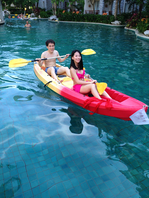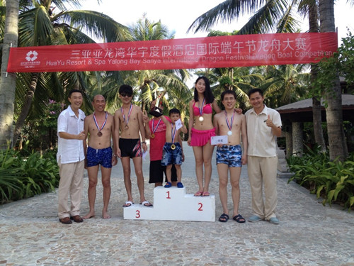 粽香飄逸、龍舟競技,2014年亞龍灣華宇度假酒店端午龍舟大賽在一號游泳池開賽。來自酒店的26位客人在泳池內(nèi)擊水競渡,歡度傳統(tǒng)端午佳節(jié)。